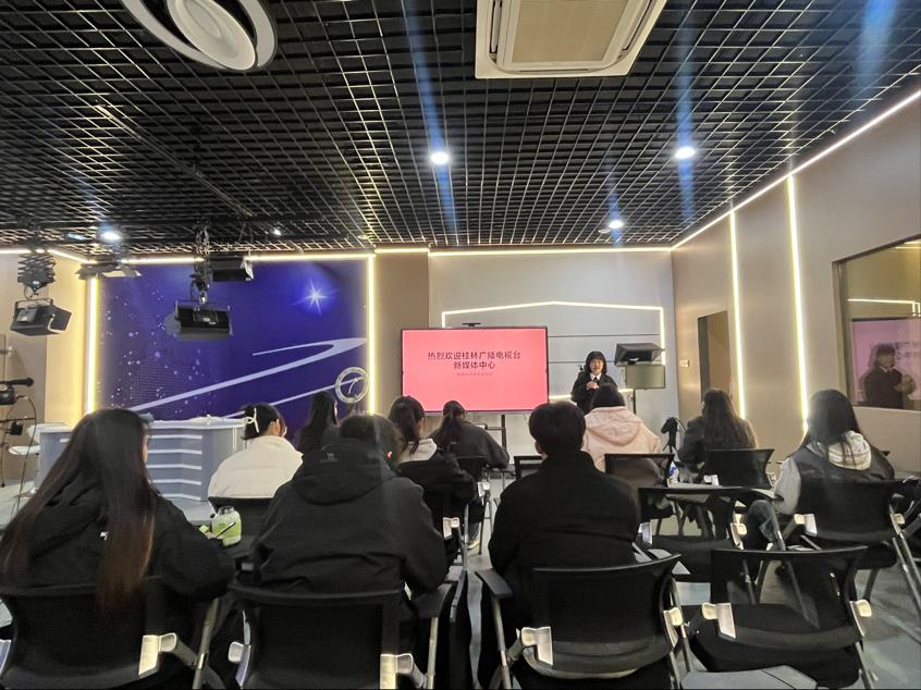 陈薇主任向同学们介绍了桂林广播电视台新媒体中心的工作流程,工作内容,新媒体作品制作与编辑,短视频平台的内容创作规范。