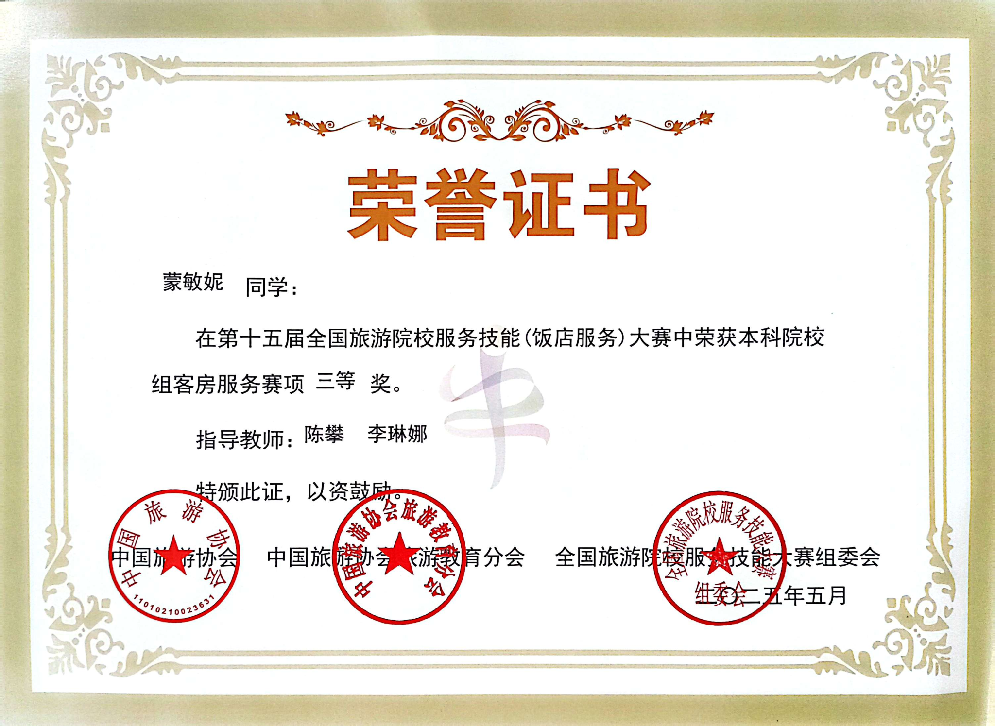 2025年5月17日,第十五届全国旅游院校服务技能(饭店服务)大赛在郑州落幕。本届大赛由中国旅游协会指导、中国旅游协会旅游教育分会主办、郑州旅游职业学院承办,吸引了全国28个省(自治区)、市的185所院校、596名选手参赛,我院旅游管理与服务教育专业学生蒙敏妮以精湛的专业技能和出色的综合素质获得中式铺床三等奖的好成绩。