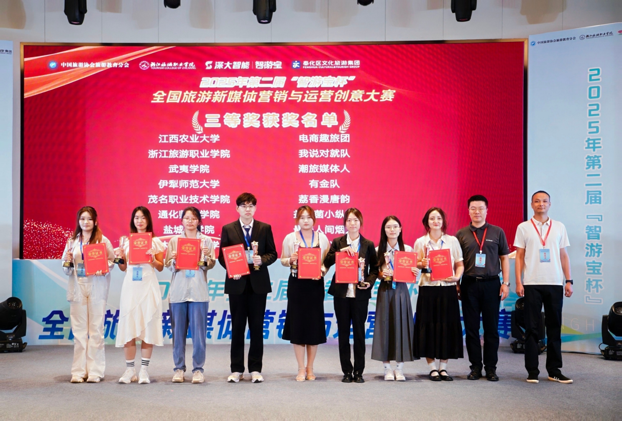 2025年6月7日,2025年第二届“智游宝杯”全国旅游新媒体营销与运营创意大赛在宁波奉化落下帷幕。本次大赛自启动以来,便受到全国百余所院校的积极响应,600多支队伍、4000多名师生踊跃参与。大赛历经初赛、实践活动和决赛三个阶段,共推出5000余个宣传视频,开展300多场直播,提交600余份营销运营方案。我院酒店管理专业蒋郡文、蒋智瑜、郑江燕、黄思涵、林欣慧组成的队伍代表学校参赛,凭借优异的现场表现荣获决赛三等奖。