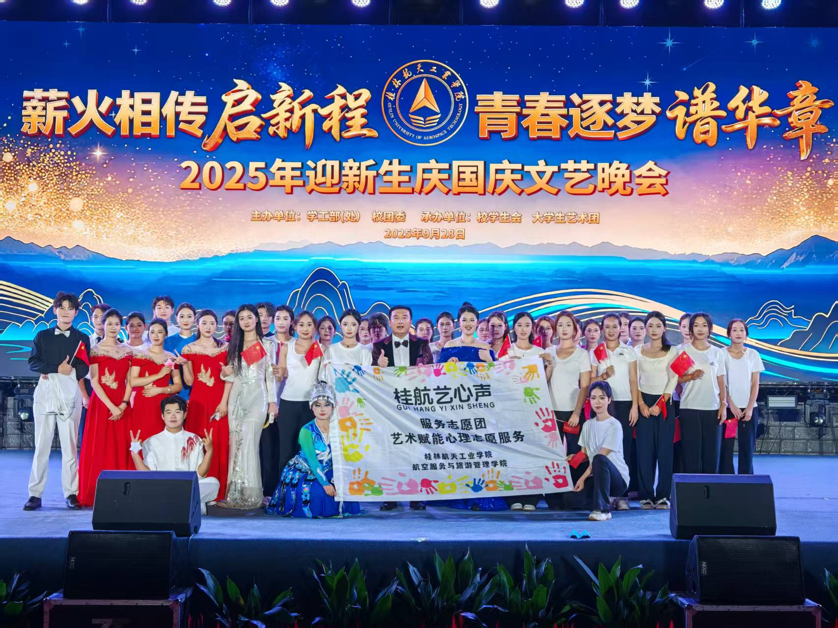 在2025年桂林航天工业学院“迎新生·庆国庆”文艺晚会上,“桂航艺心声”艺术赋能心理服务志愿团首次演唱团歌《篇章》,圆满完成首演,标志其在组织化、品牌化建设上迈出坚实一步。