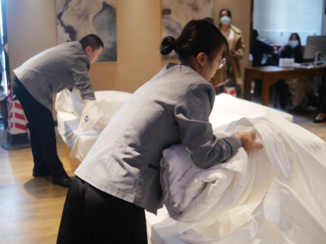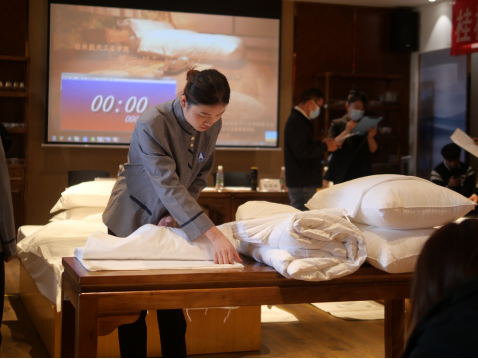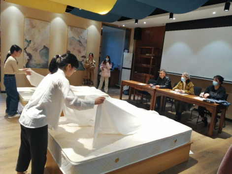 12月5日上午,客房服务技能大赛决赛在南校区天泽楼103室正式开赛。决赛选手们摩拳擦掌,在 “标准中式铺床”和“开夜床”两项专业技能上大展身手,展示自己一个多月刻苦练习的最终成果。酒店管理教研室的四位专业评委老师也一丝不苟,对每一个细节都认真评判,给出严谨且公正的打分。
