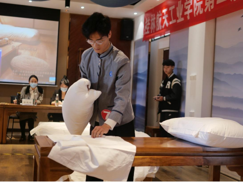 2021年12月5日上午,航空服务与旅游管理学院第二届“航旅杯”酒店服务技能(客房服务)大赛在天泽楼103室如期举办并成功落下帷幕。本次大赛于11月初正式启动,经过了理论知识考试、客房技能实操两个部分的比拼,最终角逐出优胜选手。酒店管理专业2018-2020级近40名学生参加了该项比赛。
