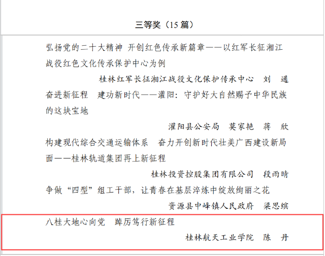 据了解,本次征文比赛活动由桂林市党的建设研究会举办,旨在深入学习贯彻党的二十大精神、习近平总书记对广西“五个更大”要求和视察广西及桂林时的重要讲话和重要指示精神。活动共收到稿件144篇。经专家评审组客观公正评审,评出一等奖5篇、二等奖10篇、三等奖15篇、优秀奖23篇。