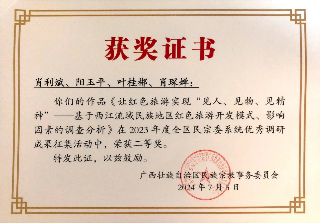 近日,自治区民宗委发布《自治区民宗委关于2023年度全区民宗委系统调研报告评比结果的通报》,学院肖利斌、叶桂郴、肖琛婵等教师提交的《让红色旅游实现“见人、见物、见精神”——基于西江流域民族地区红色旅游开发模式、影响因素的调查分析》获2023年度全区民宗委系统调研报告二等奖。
