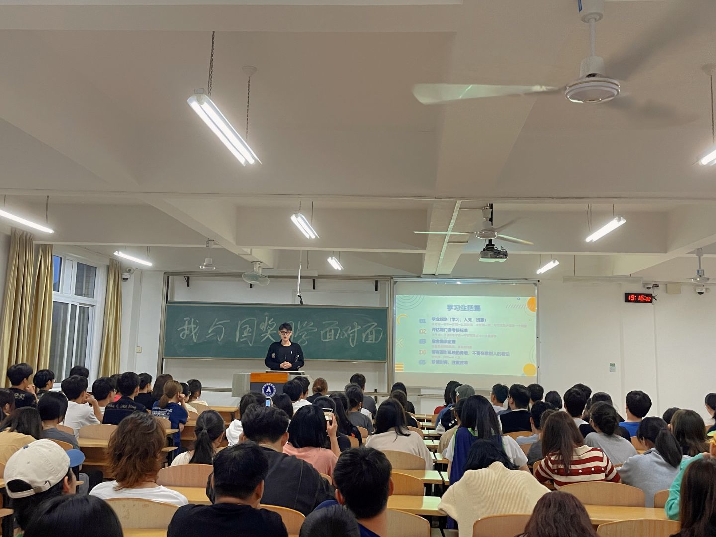 三位国奖获得者,分别从学习方法、时间管理、社会实践、目标规划等学习生活的各个方面向大家介绍了自己的经验与感悟,提供了学习建议,也为正在寻找学习与社会生活间的平衡点的同学们指引了方向。提问环节,他们有针对性地解答了一些同学关于学习与工作、社会实践方面的问题。活动现场气氛温暖活跃,前来分享经验的学业榜样风趣真诚,参与活动的同学们勤于求知,向榜样们学习努力拼搏追求卓越的成长力量